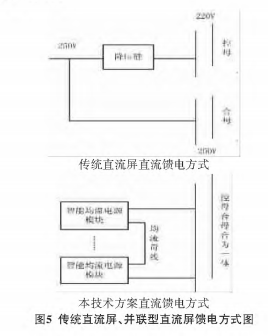 傳統直流屏控母和合母由于電壓不一致,負載要嚴格區分,比如 ,微機保護.指示燈等必須接入控母,斷路器分合閘、儲能電機等負載必須接人合母。本文所闡述的技術控母和合母的電壓等級一致,并聯輸出,可互用,方便用戶的使用。傳統直流屏、并聯型直流屏饋電方式,如圖5所示。