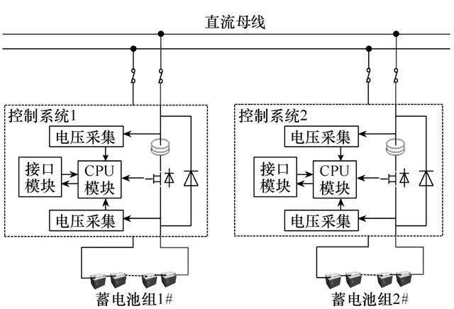 為消除傳統直流屏體系并聯時蓄電池組之間的環流問題,本文規劃一個并聯保護器對兩組電池進行完全獨立的充電管理體系,其實現原理如圖2所示。