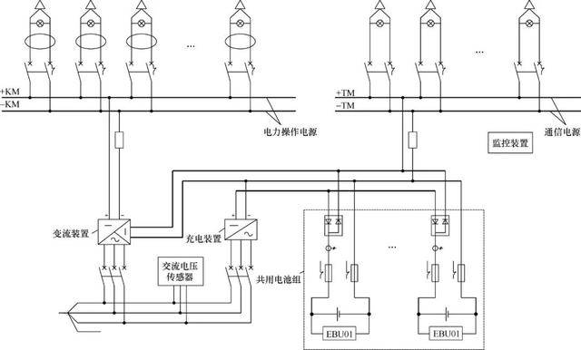1在有交流電時,電力操作電源和通訊電源各自都能獨立工作。電力操作電源選用變流設備直接整流后供給DC220V/110V直流母線,通訊電源選用充電設備經由逆流設備后供給-48V通訊電源母線,防止從DC220V/110V直流母線通過DC/DC二次電壓改換。在交流停電時,電力操作電源和通訊電源共用蓄電池組。此時,通過逆流設備并聯起來的蓄電池組,一方面能夠經變流設備升壓后供給電力操作電源,另一方面能夠直接供電給通訊電源。
