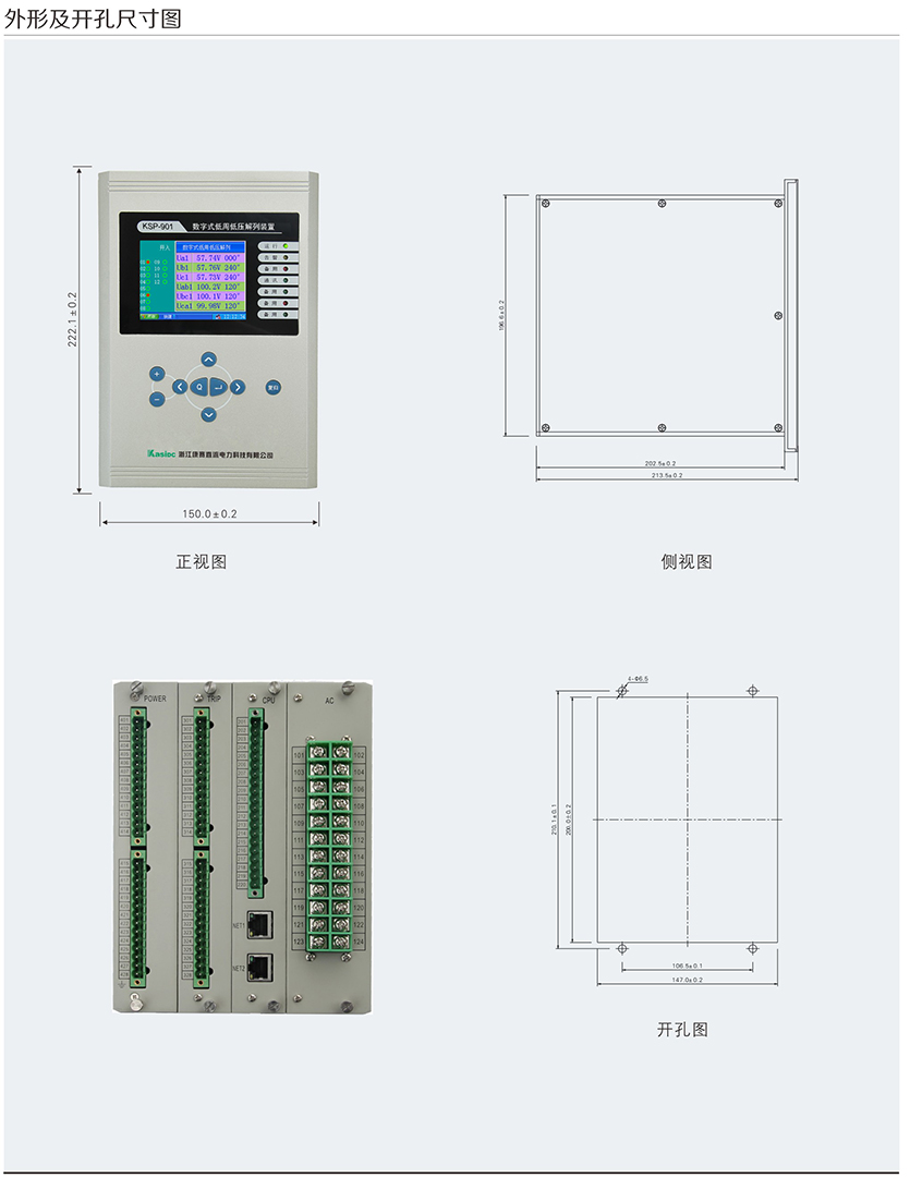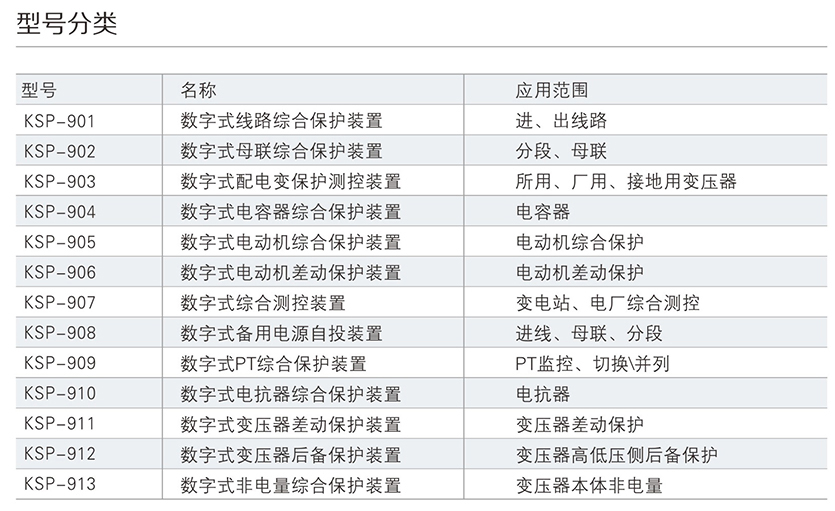 KSP-900 系列綜合保護(hù)測控裝置主要適用于 110kV 及以下電壓等級 間隔單元的保護(hù)測控,為變電站、發(fā)電廠、高低壓配電廠及廠用電 系統(tǒng)的保護(hù)與控制提供 完整的解決方案。產(chǎn)品采用完全真彩漢化的 顯示技術(shù) , 人機界面友好,使您免除査找說明書操作的煩惱。每款產(chǎn) 品均配置了基于 PC 機調(diào)試界面的接口,結(jié)合專用分析調(diào)試軟件包 , 大大改善了現(xiàn)場調(diào)試手段。裝置可以集中組屏安裝,也可以分散在 開關(guān)柜就地安裝。